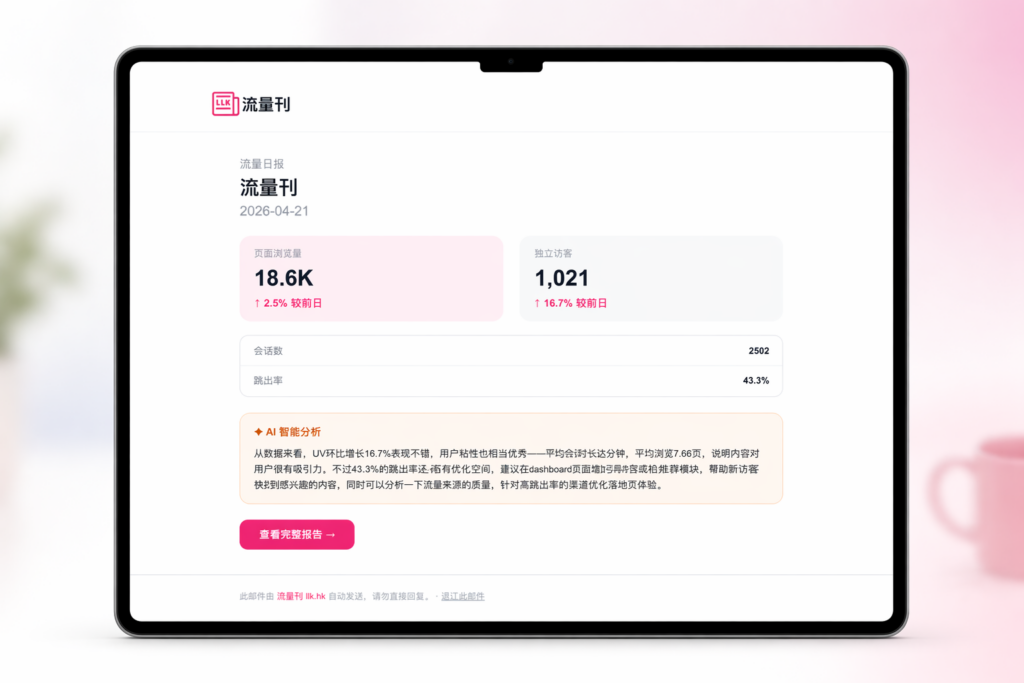 在生成式 AI 与移动互联网深度融合的今天,流量的定义正在被重塑。当传统的统计工具仍停留在简单的点击计数时,流量刊 (llk.hk) 以前瞻性的姿态正式登场——作为全网首家专注于 AI 时代流量洞察的分析平台,我们致力于通过底层技术的革新,为企业提供更具穿透力的数据视野。